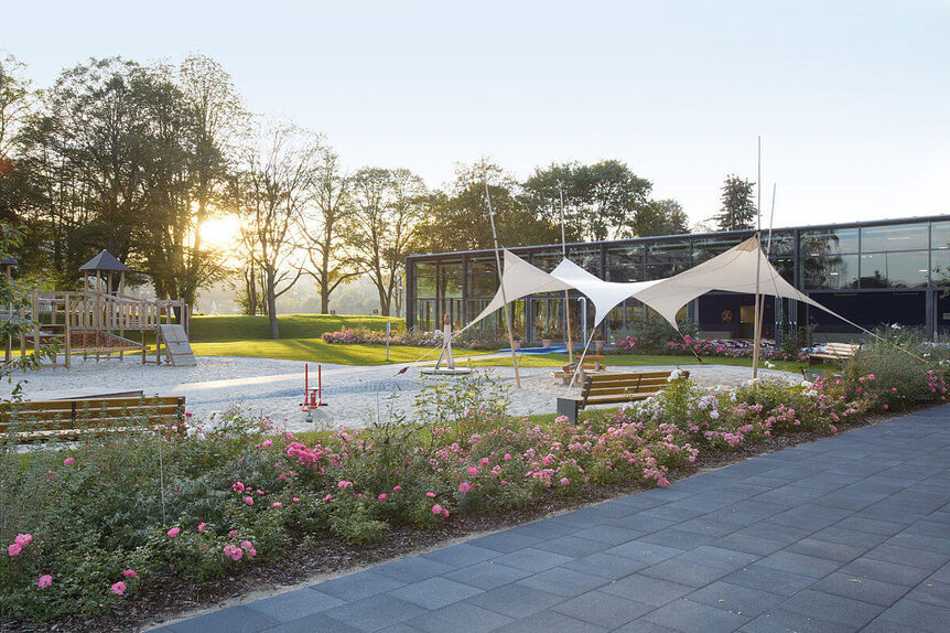 Das 25-m-Sportbecken schließt sich rechtwinklig an den Erlebnis- und Eltern-Kind-Bereich an. Den direkten Zugang zur Freibadfläche ermöglichen im Erlebnis- und im Sportbereich großflächig in die Fassade integrierte Alu-Glasfalttüren, die über die gesamte Breite geöffnet werden können. Auf dem mit viel Liebe zum Detail angelegten Außengelände befinden sich neben einer großzügigen Liegewiese ein großer Kinderspielplatz mit Schatten spendendem Sonnensegel, ein Bolzplatz sowie ein Beachvolleyballfeld. Bei schönem Wetter wird im Sommer der Kiosk auf der Liegewiese geöffnet. Damit ist auch hier für das leibliche Wohl der Badegäste gesorgt.
