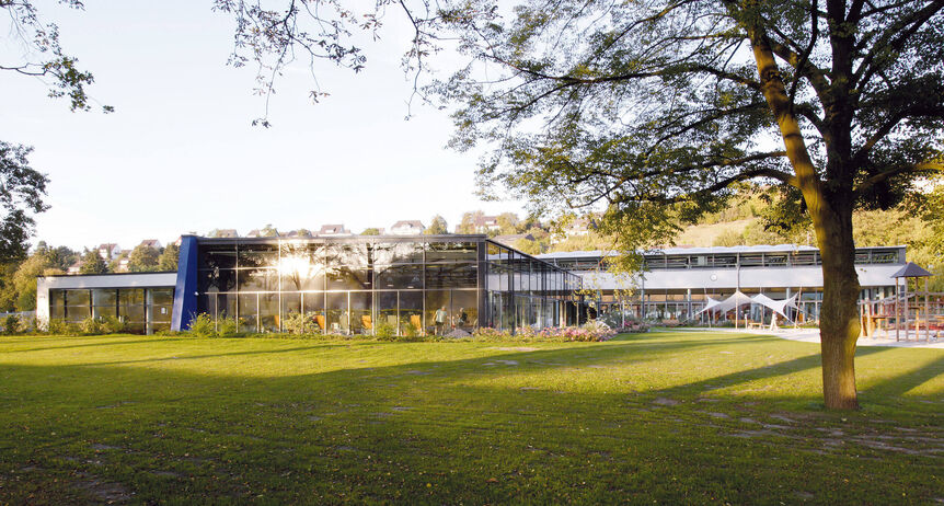 Das moderne Allwetterbad wurde auf dem ehemaligen Freibadgelände der Stadt errichtet. Das alte Sprungbecken konnte in das neue Objekt ideal integriert werden, die Flächen der historischen Freibadumkleide werden nun für die Sauna genutzt. Somit ergibt sich eine sinnvolle Integration des Neubaus in das bestehende Ensemble.