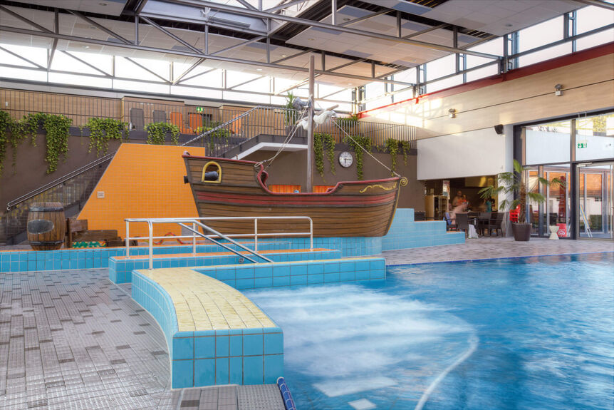 In der Achse des bestehenden Außen-Sprungbeckens befindet sich der Gebäudeteil mit dem Erlebnisbecken. Vielfältige Attraktionen wie ein Strömungskanal, ein Kletterdelphin, eine Spritzkanone, Whirlliegen, Bodenbrodler, Nackenduschen und Massagedüsen sorgen für Abwechslung und laden Jung und Alt zum Verweilen ein. Eine Blackhole-Wasserrutsche, ausgestattet mit Lichteffekten und einer Zeitmesseinrichtung, führt in ein gesondertes Landebecken im Erlebnisbereich. An das Erlebnisbecken schließt sich der Eltern-Kind-Bereich mit diversem Wasserspielzeug und einem Piratenschiff an. Die Gastronomie bedient sowohl den Erlebnisbereich als auch den Saunabereich. Der sich nach Osten orientierende Saunabereich wird über das Foyer erschlossen und ist räumlich und akustisch von den anderen Bereichen getrennt.