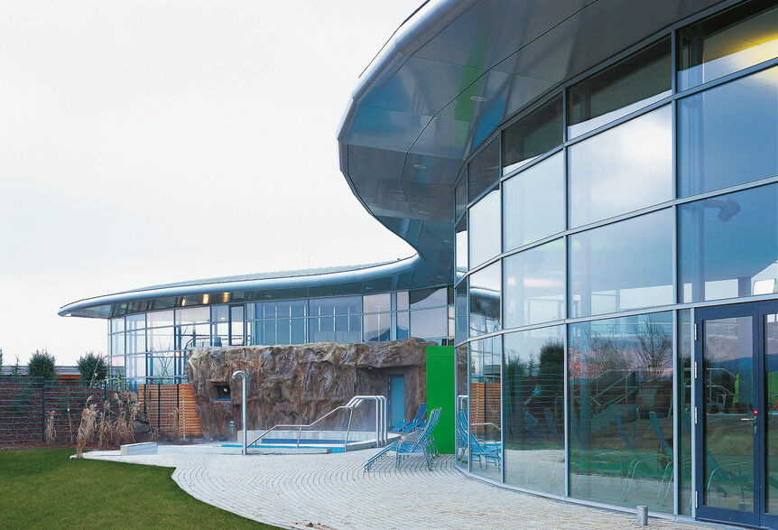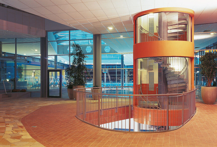 Bundesweit das erste Mal schlossen sich zwei Städte zu einem Zweckverband zusammen und bauten zwischen den Stadtgrenzen das neue Bad. Es entstand ein Bad, mit dem der Besucher einen Ausflug in die faszinierende, gleichsam erlebnisreiche wie wohltuende Welt des Rhein-Stromes unternimmt. Das alle drei Bereiche überspannende Dach bildet den Himmel, der von einem gläsernen Fluss durchzogen wird – ein Spiegelbild der Landschaft, mitten in den typischen Obstgärten der Region.