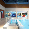 Das Besondere an dem neuen Allwetterbad ist die verfahrbare Dachkonstruktion, die über Radblöcke in Richtung Norden innerhalb weniger Minuten über eine Kranbahn verschoben wird. Bei schönem Sommerwetter kann nicht nur das Dach geöffnet werden, sondern auch die nach Süden ausgerichtete, aus Glasfaltelementen bestehende Fassade des Sportbereiches. Damit stehen auch den Freibadfans zur Nutzung der Freianlagen alle Türen offen.