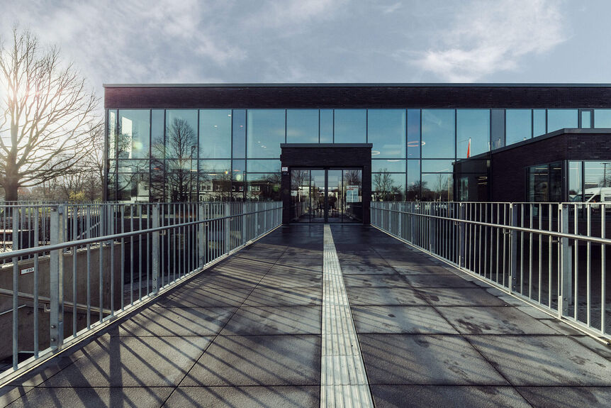 Ein dreigeschossiger Gebäuderiegel entwickelt sich parallel zum Flinger Broich. Der Gebäuderiegel ist so positioniert, dass die vorhandene Topografie aufgegriffen wird und so die Technikebene vollständig anfahrbar ist. Über eine Brückenkonstruktion wird die darüberliegende Badeebene höhengleich zum bestehenden Freibadniveau angebunden. Die Höhenentwicklung des Riegelgebäudes orientiert sich an der Umgebungsbebauung. Dem Gebäude vorgelagert ist eine neue Parkplatzsituation, die die Gäste der Physiotherapie sowie der Badehalle auf kurzem Wege über eine Magistrale hin zum Haupteingang des Riegels führt. Die Durchwegung der Erschließungsachse ist Bestandteil des Entwurfs und bestimmendes Ordnungskriterium. Über eine Gebäudefuge abgesetzt entwickelt sich die Badehalle mit eigenständiger Materialität, die durch klare Kubaturen und Materialitäten dem Standort am Flinger Broich Rechnung trägt.