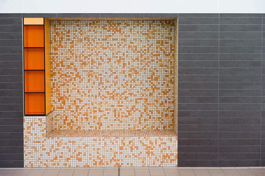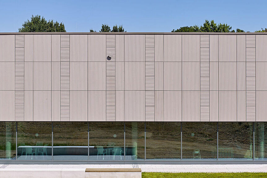 Die neue Schwimmhalle wurde so positioniert, dass sich die Badehalle zum umgebenden Grünbereich in Süd-Ostachse öffnet und im Sommer die Liegewiese als Zusatzangebot erschließt. Die Kubatur der Badehalle erhält durch ein besonders Oberflächendesign ein leichtes und modernes Erscheinungsbild. Die tiefen Dachüberstände zum Süden und Westen sorgen für einen effektiven Sonnenschutz im Winter und ermöglichen einen wetterungsgeschützten Aufenthalt im gebäudenahen Terrassenbereich. Die Eingangshalle mit Wartezone und Automatensnackzone wird zur Badeplatte aufgeglast und bietet so für wartende und abholende Personen einen attraktiven Aufenthaltsbereich, der die schwimmsportlichen Aktivitäten erlebbar macht. Zur Reduzierung des Bauvolumens wurden die Lüftungsgeräte als sichtgeschützte Dachzentrale ausgewiesen. Kurze Kanalstrecken sorgen für geringe Energieverluste und wirtschaftliche Bauweise. Die Kellerkubatur wird so um ca. 800 m³ reduziert.