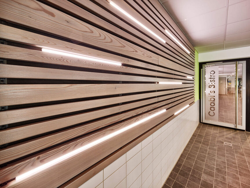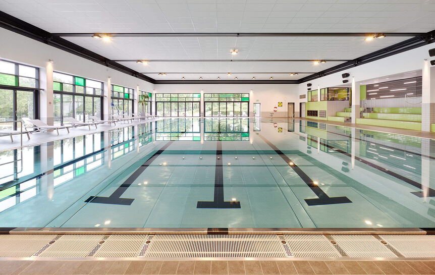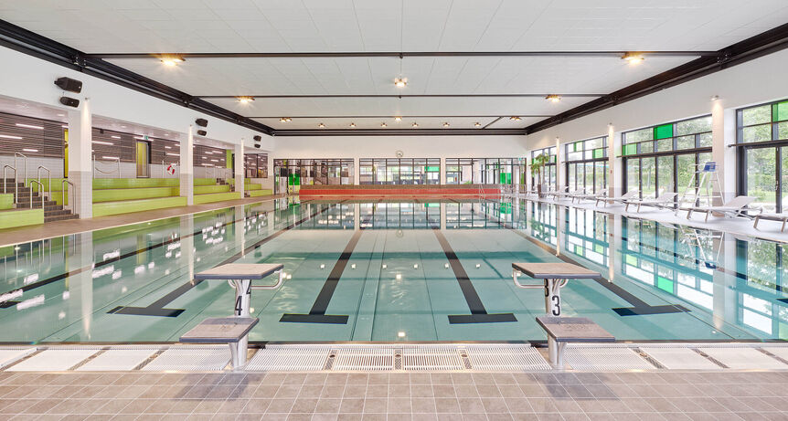 Die Sauna und der Saunagarten wurden im Obergeschoss um Büroräume und ein Bistro ergänzt. Eingangshalle, Umkleiden und Sanitärbereiche wurden vollständig bis auf den Rohbau entkernt und neu ausgebaut. Der Bereich des Mehrzweckbeckens erhielt eine fahrbare Dachkonstruktion zur Kompensation des entfallenen Freibades. Inspiriert von der Cabriotechnik des Autos, lässt sich das Hallendach bereits bei den ersten Sonnenstrahlen des Frühsommers bequem und schnell öffnen. Das wettkampfgerechte Mehrzweckbecken ermöglicht viele sportliche Aktivitäten für Schwimmer und Nichtschwimmer. Das Angebot wird durch ein Kursbecken mit Hubboden und ein Planschbecken mit zahlreichen Wasserspielen ergänzt.