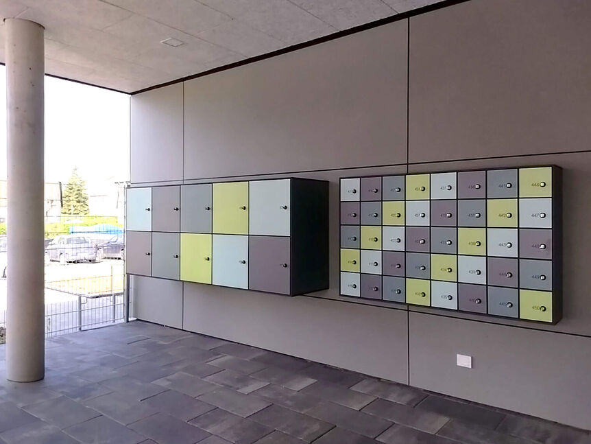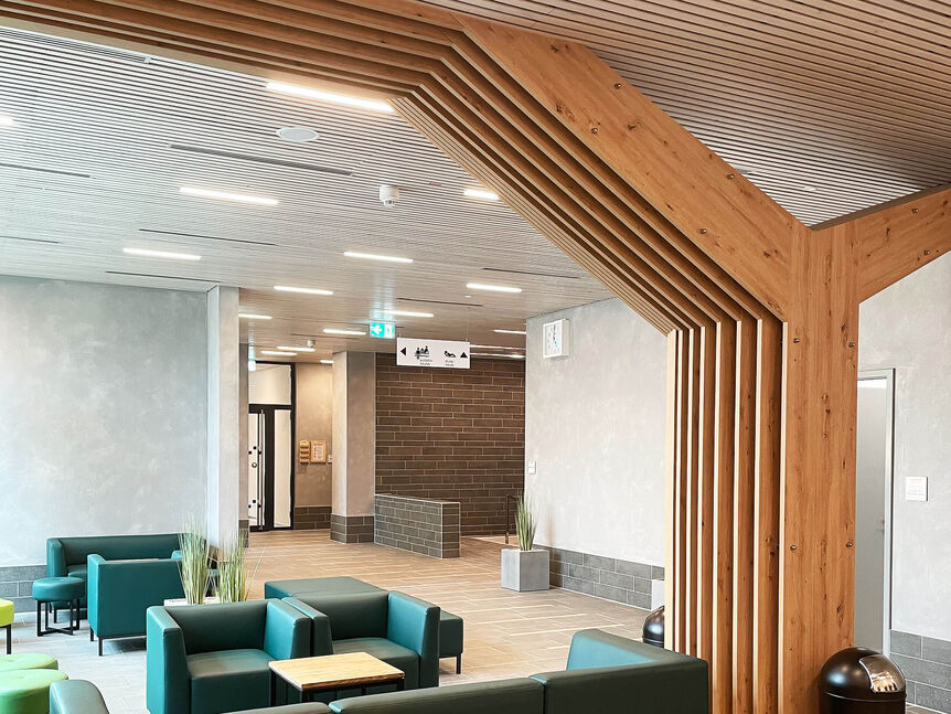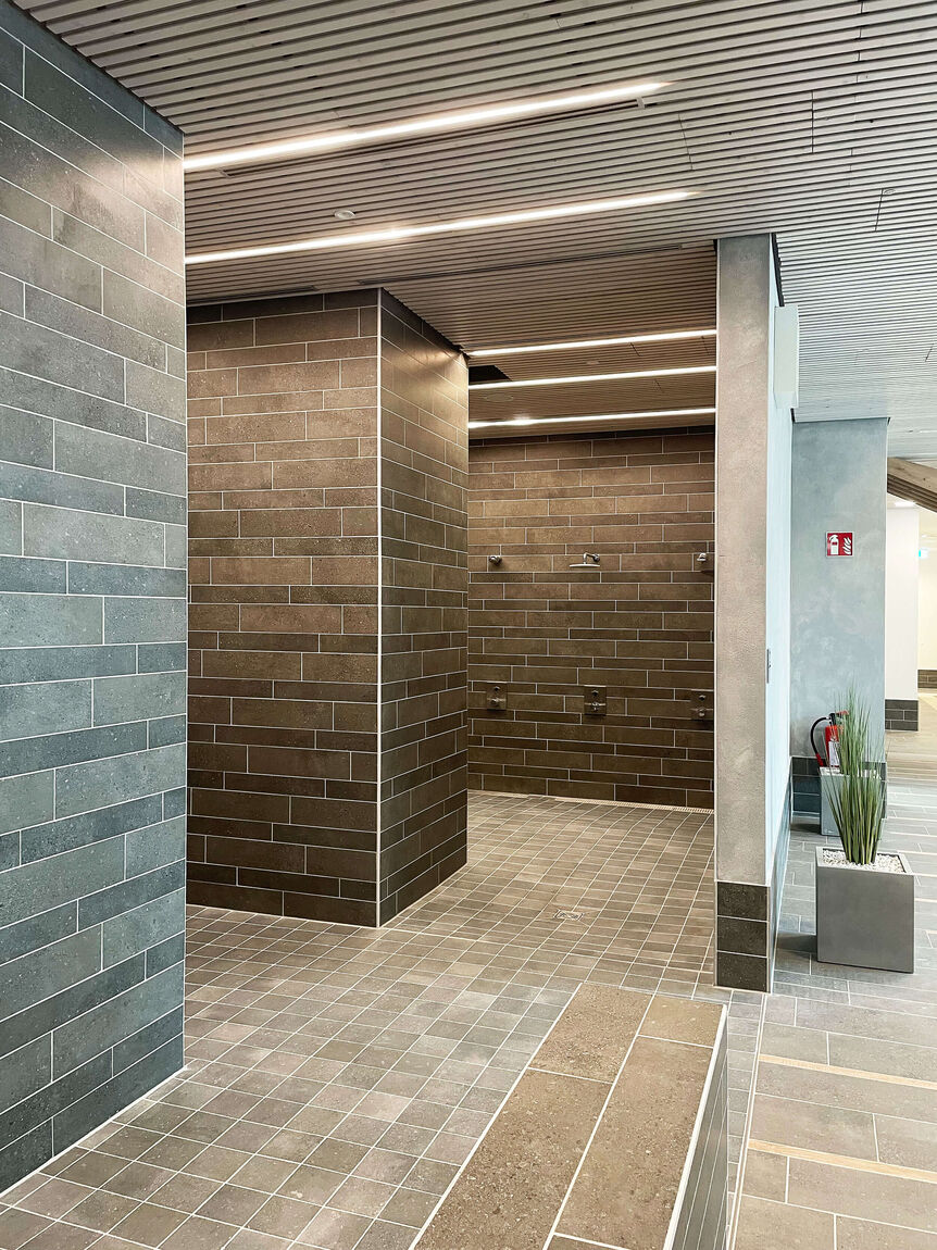 umkleiden mit 89 Ganzschränken zur Verfügung, außerdem vier Sammelumkleiden mit insgesamt 86 Ganzschränken, 56 Halbschränken und 29 Metern Banklänge. Die Sammelumkleiden verfügen über je eine separate Lehrer-/ Trainerumkleide. Durch die Anordnung der Wechselzellen erfolgt eine klare Trennung von Stie-fel- und Barfußgang. Über eine Zwangswegeführung vorbei an den Vorreinigungen, gelangt der Badegast in die Badehalle. Zu den Umkleiden gehören auch zwei barrierefreie Umkleide mit je-weils fünf Spinden, Liege, WC mit Dusche und einem gemeinsamen Rollstuhlwechselbereich.