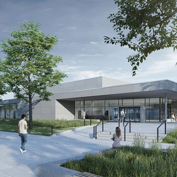 Der Baukörper wurde unter Wahrung der vorhandenen Baufluchten entlang der Seckbruchstraße auf derselben Fläche des vorhandenen Hallenbades unter Ausnutzung des vorgegebenen Bau-feldes platziert. Die vorhandenen Stellplätze wurden Großteils erhalten. Der Baukörper nimmt den Patz des be-stehenden Bades ein, welches vor Baubeginn rückgebaut wird. Der Hauptzugang ist seitlich zur Seckbruchstraße und Parkplatz ausgerichtet, zu der ein ausrei-chend großflächig gestalteter Vorplatz mit einladender Treppenanlage formuliert ist, über den sämtliche Besucherströme das Bad erreichen können. Die Anbindung der vorhandenen Stellplatzanlage zu den neuen Parkplätzen gewährleistet eine Weiterführung der vorhandenen Verkehrsanbindung.