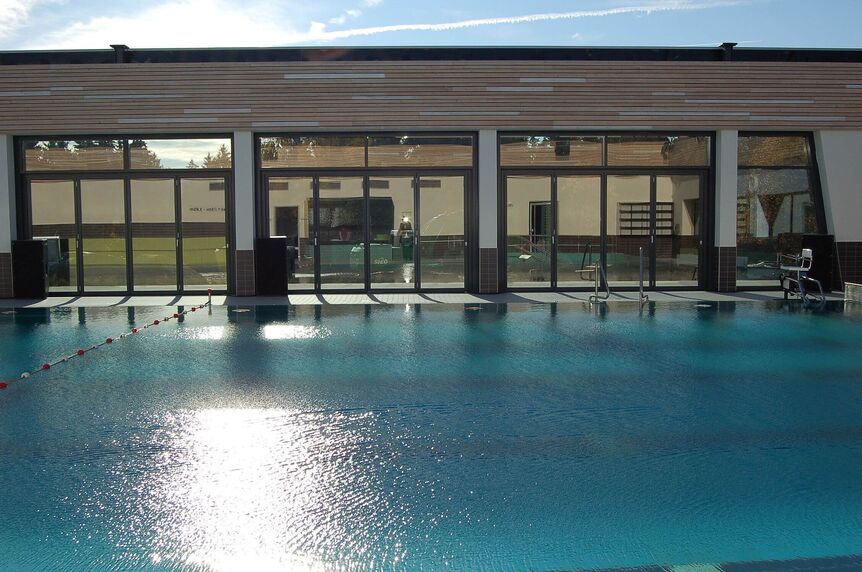 Dieses Konzept ermöglicht dem Betreiber innerhalb von wenigen Minuten bei den ersten warmen Sommer-Sonnenstrahlen das Dach sowie die Glasfaltwände zu öffnen und so eine Freibad-Atmosphäre zu schaffen. Der gesamte Baukörper besteht aus zwei Ebenen und fügt sich harmonisch in die Topographie der Landschaft ein. Durch die Verwendung des nachwachsenden Rohstoffes Holz in der Fassadengestaltung wird bereits auf den ersten Blick Regionsverbundenheit vermittelt. Dies fördert außerdem die ökologische Akzeptanz des Neubaus bei der Bevölkerung.
