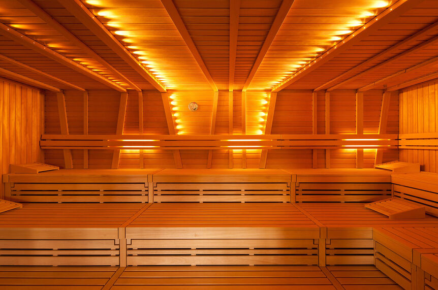Die Holzoptik der Dekore in den Umkleidekabinen und in grüne Laubfarben getauchte Schränke geben dem Badegast auch hier das Gefühl, sogar im Innenbereich von Natur umgeben zu sein. Die Verkleidung der Schwimmhalle mit Lärchenleisten prägt die visuelle Atmosphäre und reduziert zudem die Nachhallzeiten. Der oben liegende Gebäudeteil mit dem Saunabereich schiebt sich zwischen die vorhandenen und nachverdichteten Baumstrukturen und geht eine scheinbare Verbindung mit diesen ein. Auch hier wird der Besucher durch Dekorationselemente und einem speziellen Beleuchtungskonzept immer wieder an das Thema Wald erinnert.
