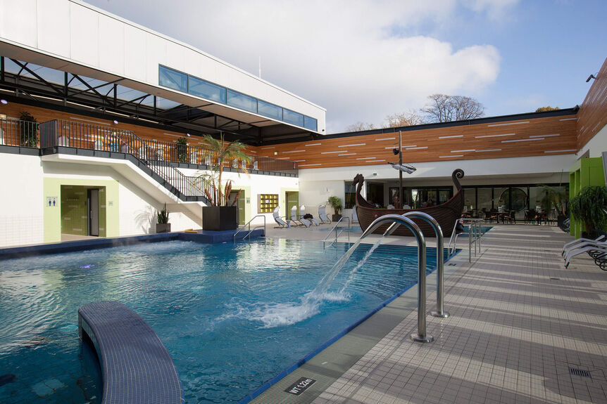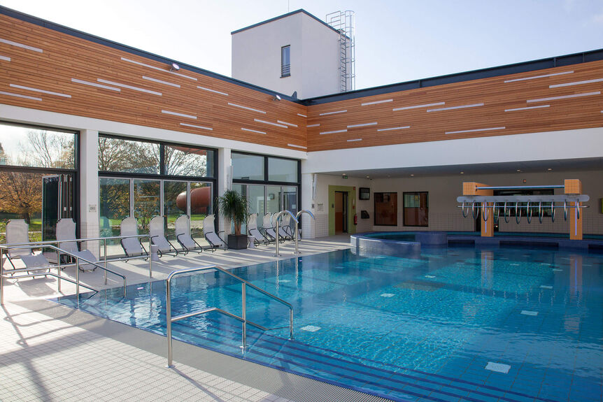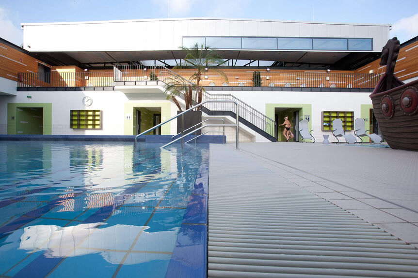 Neben diesen Personalaufgaben zählen zum Aufgabengebiet der DSBG außerdem vielfältige Verwaltungs- und Organisationsthemen. Bereits in der Planungsphase wurden für das Familienbad attraktive Alleinstellungsmerkmale herausgearbeitet und im Raumprogramm festgeschrieben, um im Wettbewerb punkten zu können. Das Bad zeichnet sich nun durch ein 25-m-Sportbecken mit sechs Bahnen und ein Lehrschwimmbecken mit Hubboden für den Schul-, Vereins- und Kurssport aus. Ein kombiniertes Lehrschwimm- und Erlebnisbecken, eine Rutsche sowie ein Eltern-Kind-Becken gehören zu dem sinnvoll zusammengestellten Portfolio.