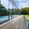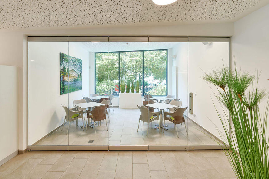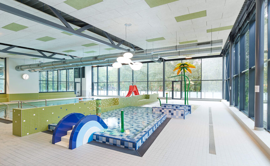 Der nördliche Baukörper mit Eingang, Umkleiden und Sanitärbereichen ist kompakt, dank großzügiger Unterbrechungen in der Fassade sind die Räume lichtdurchflutet. Das Foyer ist als zentraler Treffpunkt konzipiert, mit einladendem Lounge-Bereich und direktem Blick in die Badehalle. Transparenz und kontrastreiche Farben im Inneren tragen zum Wohlfühlen bei. Die Fassadengestaltung wurde im Innenraum der Schwimmhalle aufgenommen und weitergesponnen. Die Auftraggeber sind zufrieden: Sie hatten sich ein familienfreundliches, attraktives Schwimmbad gewünscht, das in allen Details barrierefrei ist. Daher gibt es größere und behindertengerechte Einzelumkleiden, Familienumkleiden und Wickelmöglichkeiten, Platz für Straßen-Rollstühle und Rollatoren. Alle Bereiche sind ebenerdig und der Zugang zum Becken kann mit einem Behinderten-Lifter erfolgen. Das Angebot umfasst Mehrzweckbecken, ein Lehrschwimmbecken und den Eltern-Kind-Bereich. Entlang der Südfassade gibt es eine Außen-Terrasse. Über Sie hinweg planten wir wunderschöne Blickbeziehungen in die Baumkulisse. Das Bad wird angenommen, die Besucherzahlen stimmen.
