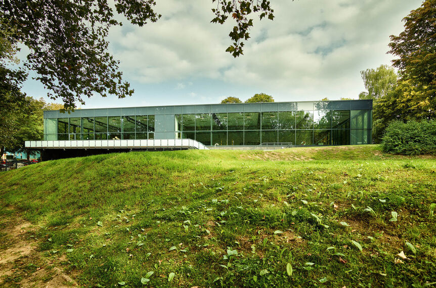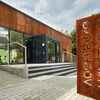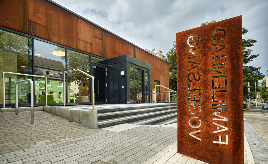 Solingen nennt sich wegen seiner langen Tradition in der Produktion von Qualitätsklingen und -scheren offiziell die Klingenstadt. Die Stadt liegt im Bergischen und das neue Hallenbad in einer bewaldeten Senke mitten in einem gewachsenen Wohnviertel. Kommt man von Norden, fällt es mit seiner rostdunklen Fassade aus dem in der Region verankerten Corten-Stahl erst spät auf und fügt sich scheinbar unaufgeregt in das Straßenbild, bis man davor steht. Dann entfaltet sich mit voller Wucht die Wirkung der Stirnseite und ihrer durch Witterung geprägten Patina, die dem Hallenbad das Gesicht eines edlen Repräsentativbaus verleiht. Kommt man von Süden, ist es die offene Fassade aus Stahl und Glas, die souverän zwischen dem reichen Baumbestand hervorlugt und sich neben dem urbanen Skaterpark selbstverständlich einfügt.