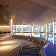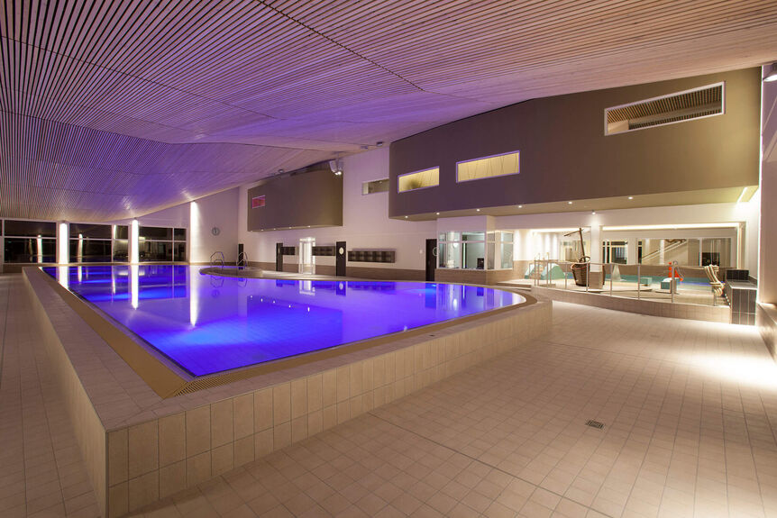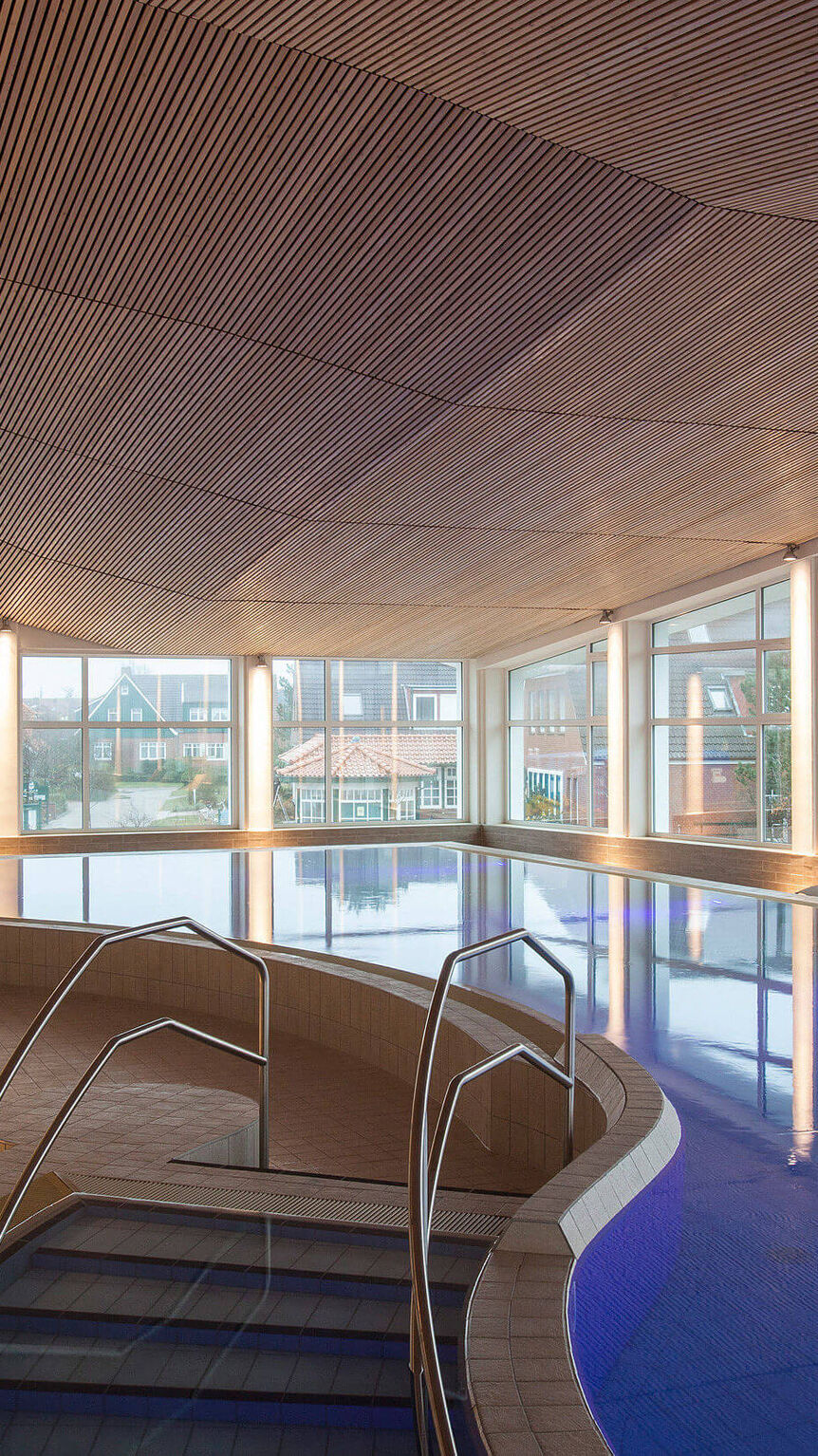„Für alle war es eine große Herausforderung, hier zu bauen. Für die Planer ebenso wie für die ausführenden Firmen. Wer ein Werkzeug oder Material vergaß, konnte nicht mal eben nachbestellen. Das hätte den ganzen Zeitplan durcheinander geworfen“, erzählt uns der Bereichsleiter Tourismus Patrick Kösters, während er uns durch die Schwimmhalle führt. Der Blick fällt dort unweigerlich auf die wellenförmig ansteigende Holzdecke, von der die Projektbeteiligten zu Recht begeistert sind. Sie wirkt beruhigend, selbstverständlich, großzügig.