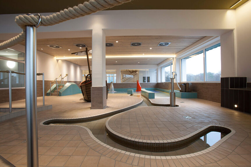 Auch im Eltern-Kind-Bereich findet sich Spiekeroog wieder. Den kleinen Flusslauf kennen wir schon von der Wanderung am Meer, wenn die Ebbe den Strand zum Spielen freigibt. Aber auch die Liegeflächen fehlen: „Wer hier mit Kindern Urlaub macht, soll sich auch mit ihnen beschäftigen und nicht daneben liegen“, leicht schmunzelnd bestätigt Herr Kösters den pädagogischen Anspruch, den es wohl auf der Insel gibt.