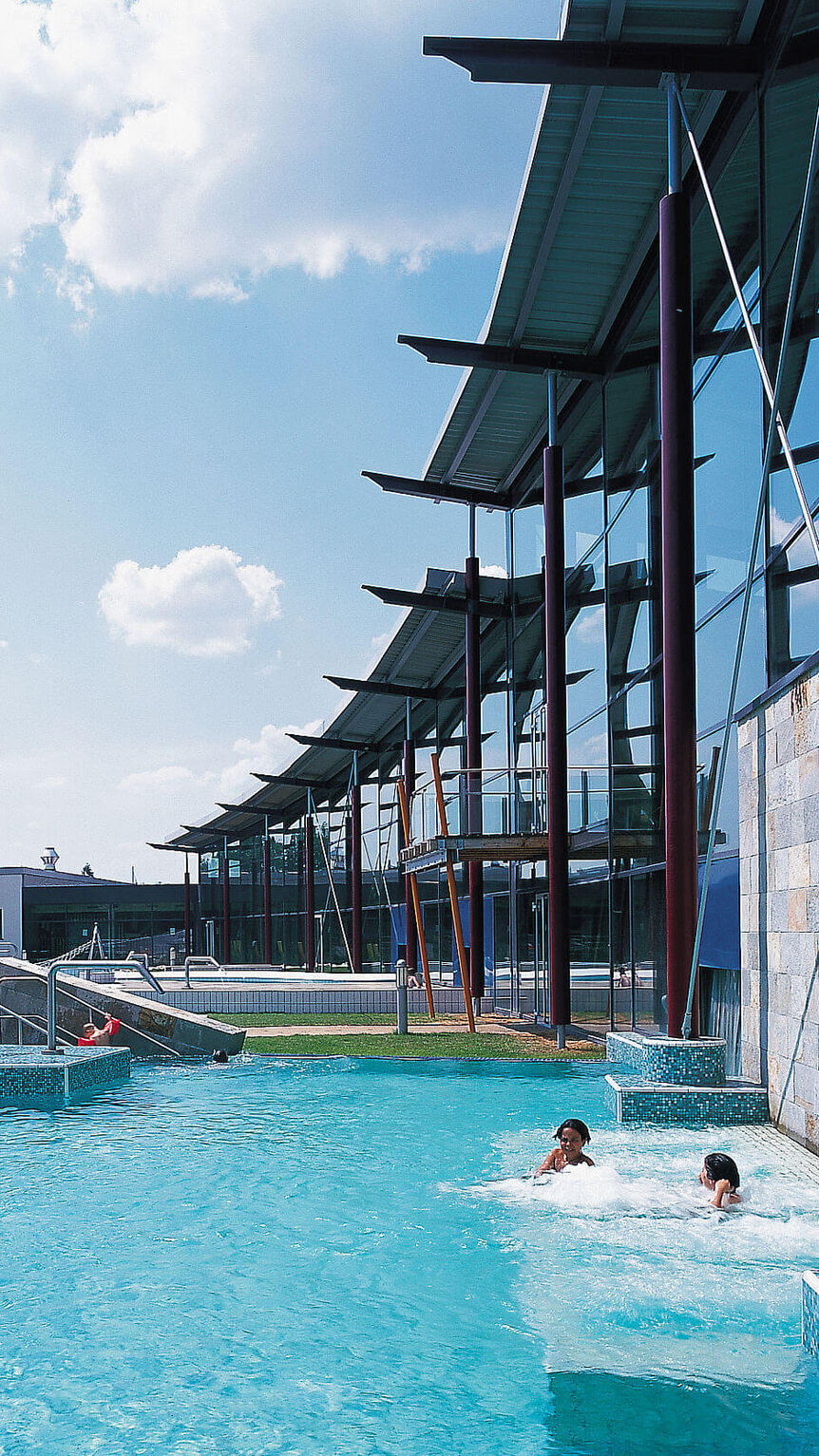 Jürgen Knebel: „Bereits im Jahre 1996 haben wir uns aufgrund einer Machbarkeitsstudie für ein Raumprogramm entschieden, das jeweils zu einem Drittel die Bereiche Sport, Spaß und Wellness umfasste. Da bereits ein Jahr nach der Eröffnung 1999 die prognostizierte Anzahl von Saunagästen deutlich überschritten war, wurde 2001 zum ersten Mal die Sauna erweitert. Die Anzahl der Saunagäste lag dann auch schon sehr bald bei über 30.000 Besuchern pro Jahr.