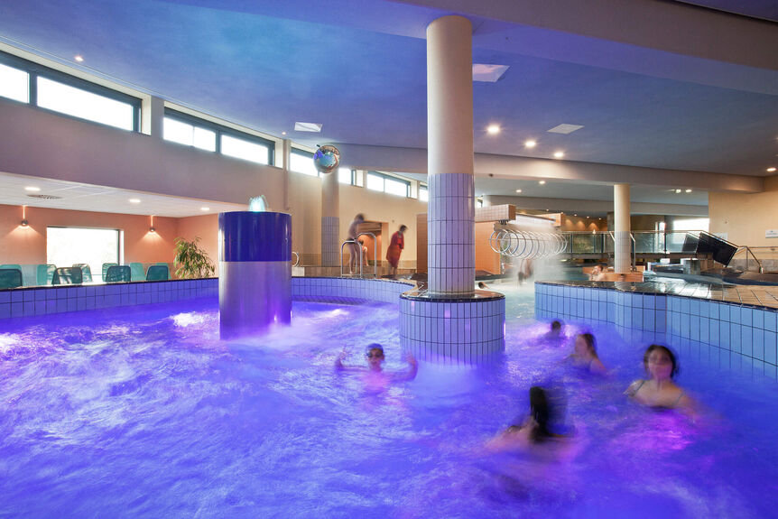 Das Projekt war durchaus ehrgeizig, denn es galt eine Fläche von 350 m2 zu überdachen. Als Lösung wurde eine geneigte Stahlfelge konzipiert und mit vierlagigen ETFE-Folien überspannt. Ein in dieser Form in Europa einzigartiger Ansatz, der jedoch in seiner Wirkung voll zum Tragen kommt. Neben dieser Erweiterung wurde auch das bestehende Erlebnisbecken auf den Prüfstand gestellt und mit einem neuartigen Wave-Tower zum neuen Publikumsliebling entwickelt. Der Wave-Tower erzeugt in regelmäßigem Abstand Wellen, die zum nassen Vergnügen einladen.