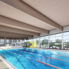 Die Innenarchitektur ist durch die materialimmanente Farbgebung der Konstruktionen gekennzeichnet. Tragende Wände und Stützen sind – abgesehen von niedrigen gefliesten Sockeln – in hellem Sichtbeton gehalten. Ein im ganzen Objekt einheitlich verlegter Fliesenboden mit anthrazitfarbigem Natursteincharakter bildet die Basis für weitere im positiven Sinn „schlicht“ gehaltene Farbigkeit: Die Edelstahlbecken schimmern je nach Tageslicht in unterschiedlichem Blau, abends durch die farbigen Unterwasserscheinwerfer ebenfalls. Das Eltern-Kind-Becken ist mit unterschiedlichen blauen Mosaiken gestaltet. Das sichtbare Dachtragwerk aus Holz und die akustisch wirksame Decke aus Fichte-Leisten geben der Schwimmhalle einen warmen Charakter.