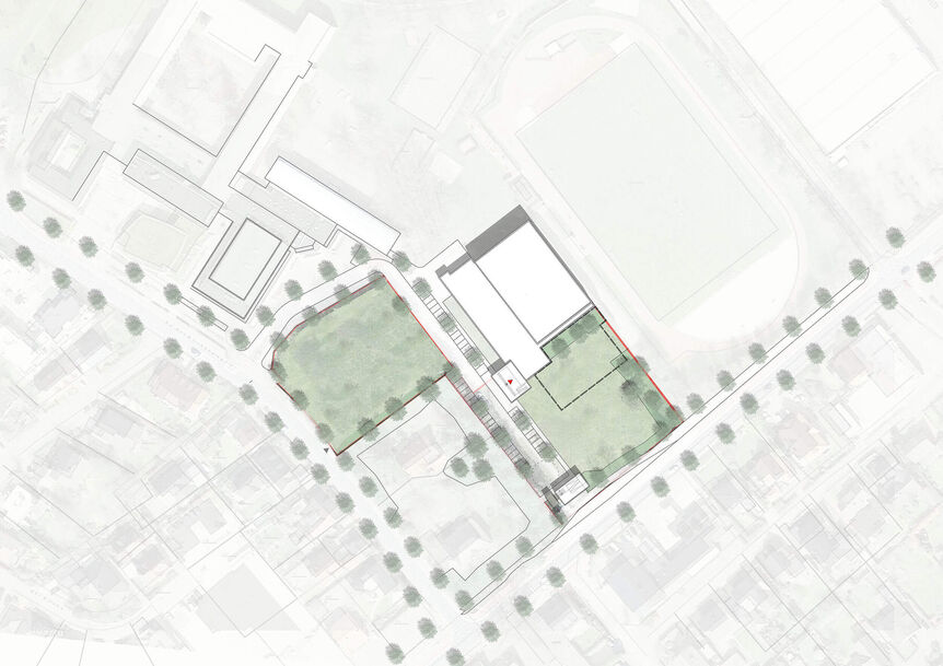 Das Planungsgrundstück des neuen Hallenbades in der Stadt Lohne ist Teil eines Sport- und Freizeitareals in unmittelbarer Nähe der Schulgebäude des Gymnasiums, sowie der Park- und Freianlagen auf dem Flurstück 65/7. Die bebaubaren Baufelder sind durch eine Mittel- bzw. Erschließungsachse miteinander verbunden, an welcher sich Parkplätze reihen. Entwurfsgedanke ist eine Aufwertung dieser Achse, welche die jeweiligen, gegenüberliegenden Eingänge von Sport- und Schwimmhalle miteinander verbinden soll und eine direkte Zuwegung zur Bushaltestelle auf der Lindenstraße schafft. Durch großzügige Vordächer und eine durchgängige Beleuchtung wird eine ansprechende Nutzung möglich. Nach Abbruch des vorhandenen Hallenbades gibt es die Möglichkeit auf der Freifläche einen Sportpark mit Verweilzonen und Einrichtungen für sportliche Aktivitäten (z.B. Beachvolleyball, Flächen für Skater) vorzusehen. Das bisher eher zusammenhanglos wirkende Konglomerat aus Sport- und Freizeitanlagen erhält so eine Adresse und folglich städtebauliche Präsenz.