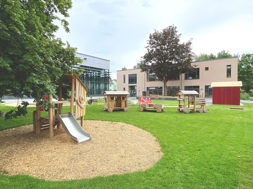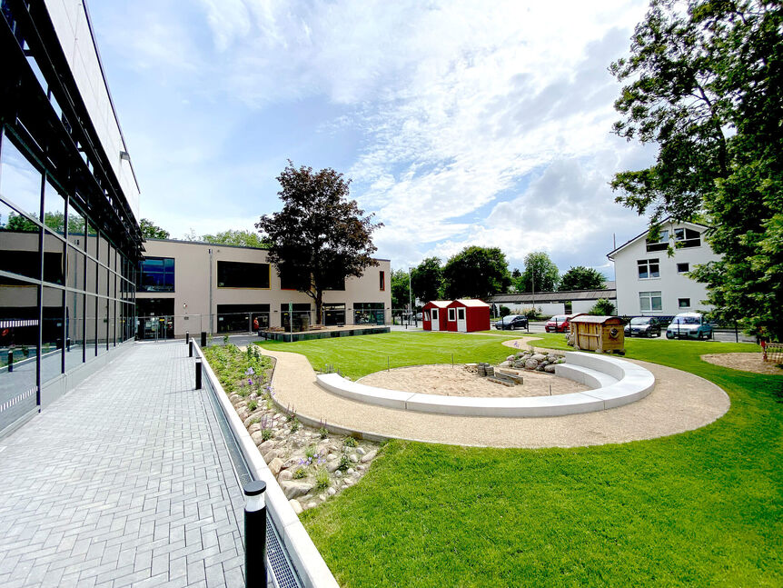 Hier handelt es sich um den Neubau einer 4-gruppigen Kindertagesstätte am Standort des ehemaligen Paul-Lemmertz-Bades. Die Kita entsteht parallel zum Ersatzneubau des Hallenbades auf dem gleichen Baufeld. Das für den Bau der Kita verbleibende Restgrundstück entwickelt sich in seiner Längsachse in nordsüdlicher Richtung. Sämtliche Gruppenräume und Gruppennebenräume werden über Türanlagen barrierefrei an die Außenspielfläche angebunden. Über einen Vorplatz wird die Kita an den ca. 900m2 großen Freibereich im Westen erschlossen. Der Vorplatz kann somit großzügig sowohl für das Hallenbad wie auch als Außenspielbereich für die Kita-Kinder genutzt werden.