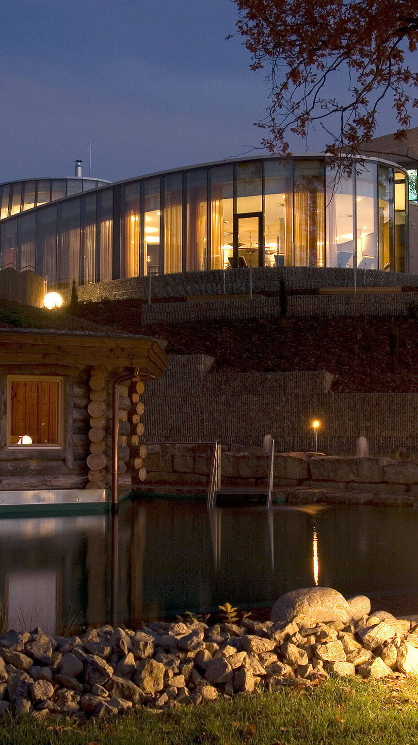 Die architektonische Gestaltungsform mit seinen transparenten Glasfassaden und einem herrlichen Panoramablick über Bad Rappenau bieten ein entspannendes Saunavergnügen. Die Sauna-Gastronomie strahlt Gelassenheit und Gemütlichkeit aus. Im Saunagarten entstand durch den alten Baumbestand eine besonders schöne Atmosphäre – Kelosauna, Panoramasauna und Erdsauna wurden rücksichtsvoll in die Natur integriert.